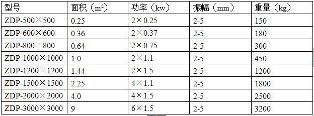 注:此表為上、下振形式振動平臺技術參數,僅供參考;此外可以根據用戶實際使用需要定做臺面大小來選用振動電機數量及功率。